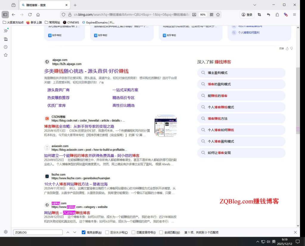 - 早上查询网站在BING上的关键字“赚钱博客”的排名结果:第6位。